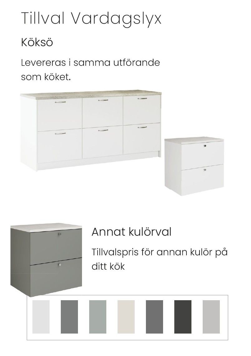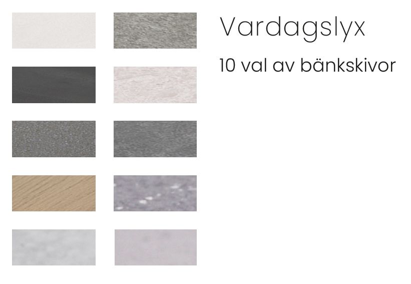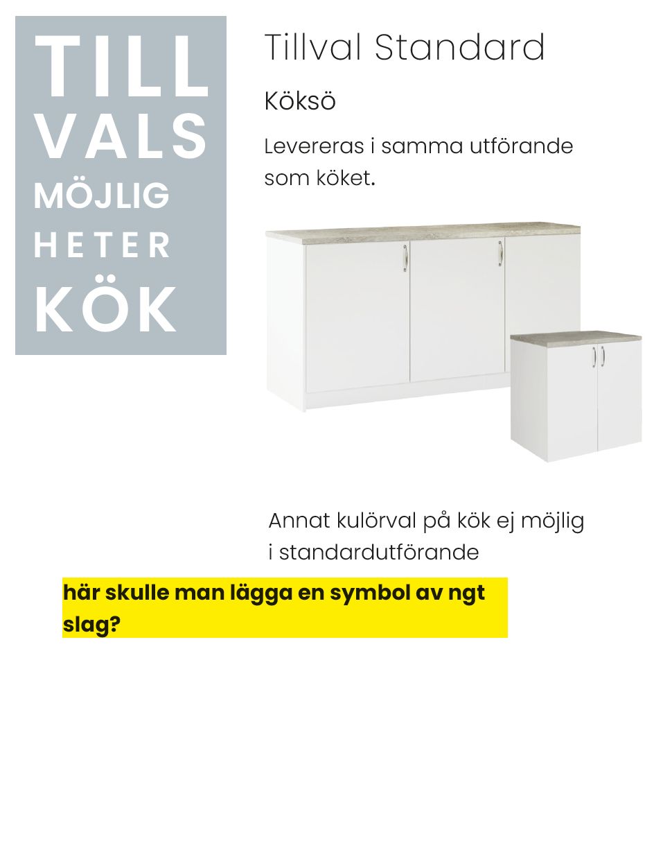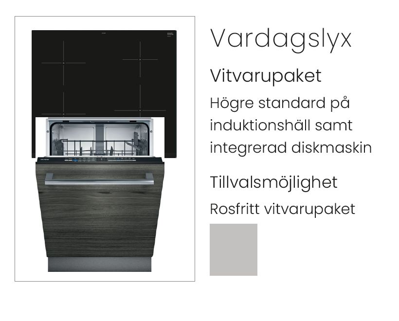 För kök och badrum finns två valmöjligheter, standard eller vardagslyx. Om du valt vardagslyx blirbåde kök och badrum uppgraderat. De olika paketen går ej att kombinera. Under sidan för kök ochbadrum kan du se vad som ingår i vardagslyxpaketet.