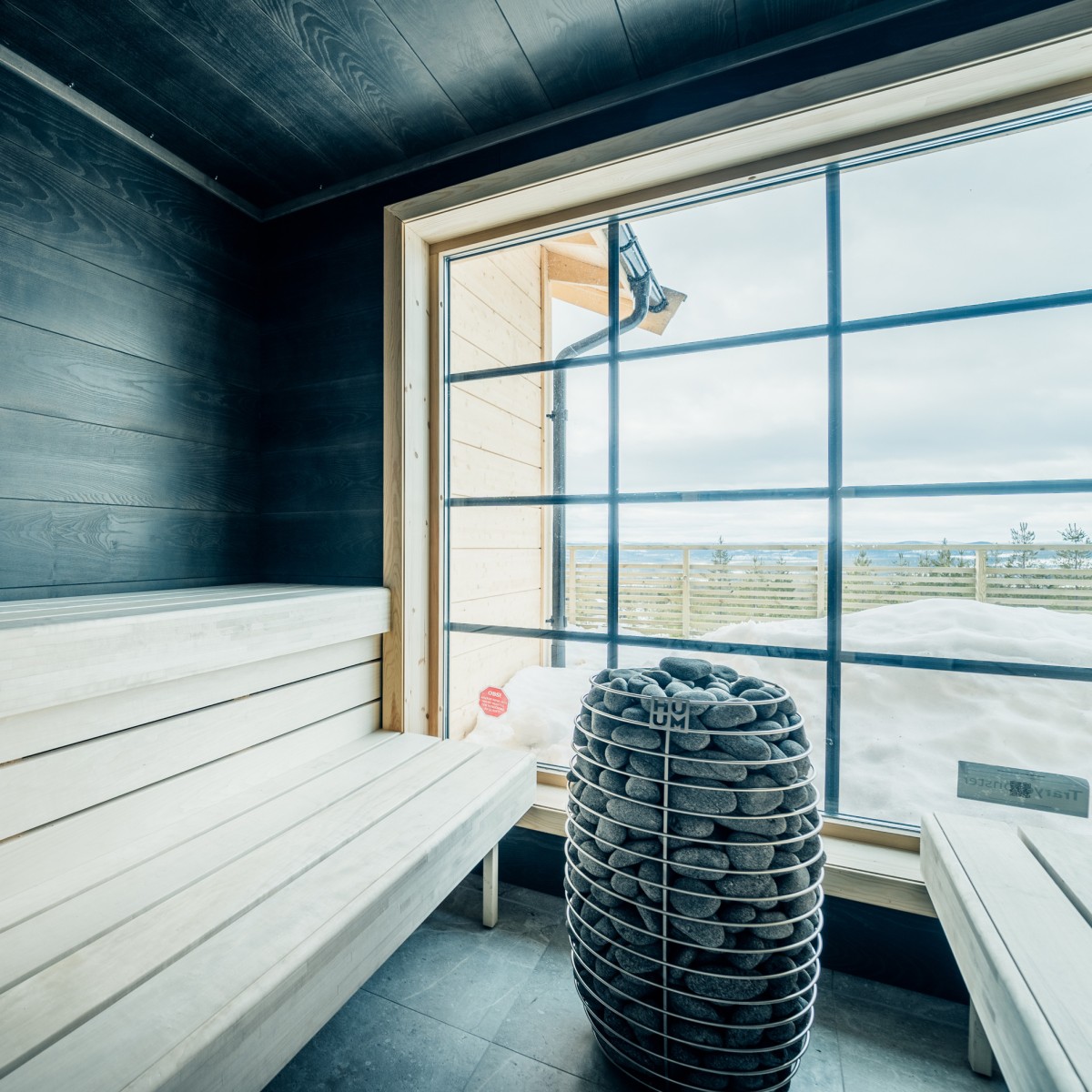 En annan av Fridas favoriter i huset är bastun med utsikten och naturstenskänslan i badrummet med svarta detaljer.