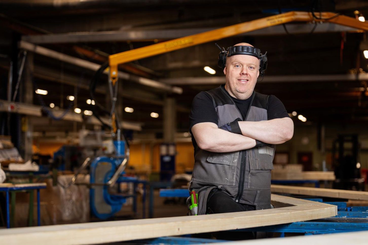Tobias Lundgren har jobbat på Bra Hus sedan 1994 – en lojal lagspelare som hunnit med det mesta i fabriken. Han började på hyvleriet vägg i vägg, men har sedan dess haft olika roller i hela produktionen. I dag trivs han bäst på takstolarna: