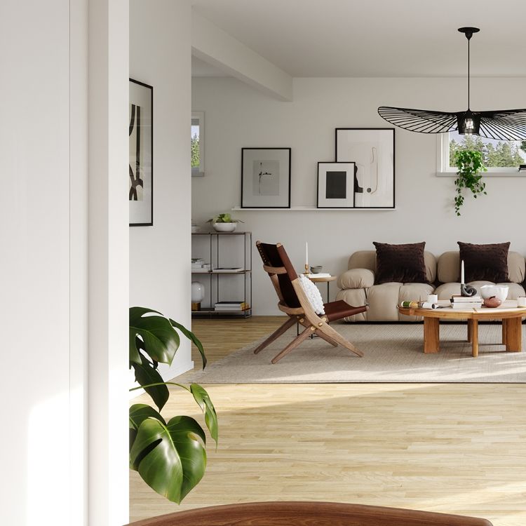 Om du enbart vill att bottenplan ska fungera som en umgängesyta så kan du köpa till en köksö i köksdelen för mer arbetsyta och använda vinkeldelen i vardagsrummet som tv-rum.